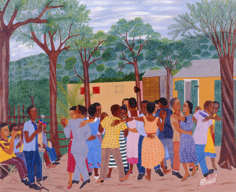 Look: Give students time to observe the painting. Ask them to notice how the people are interacting, what activities they are doing, and how they express themselves. Encourage them to think about what values might be important to this community based on what they see. Ask questions like, what do you think the people in the painting care about? How are they showing friendship, family, or community? How might their ways of celebrating or expressing feelings be different from your own or other cultures you know?